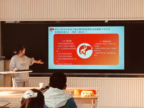 为使同学们对未来发展路径有更具体、更直观的理解,活动还组织同学们学习了《中共中央关于制定国民经济和社会发展第十五个五年规划的建议》。通过对内容的梳理和解读,同学们清晰地了解了未来五年国家发展的战略方向、重点任务、政策举措以及贯彻落实的路线图。从科技创新到产业升级,从区域协调到绿色转型,从共同富裕到国家安全,宏伟蓝图徐徐展开,激发了同学们对未来的无限憧憬与强烈责任感。