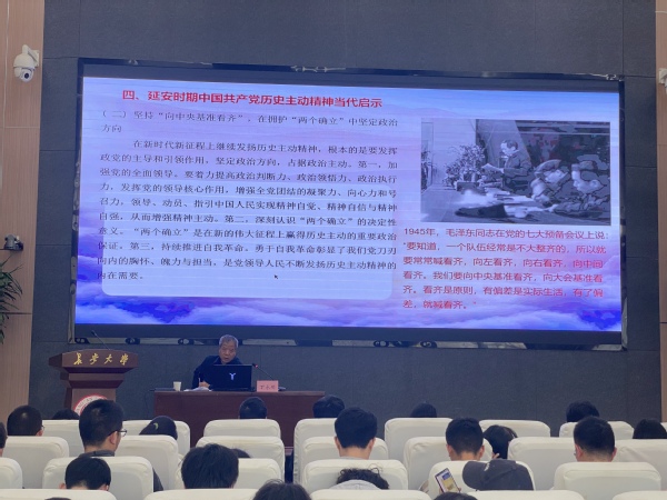 宣讲中,丁永刚教授围绕延安时期中国共产党历史主动精神的生成逻辑、具体实践、主要内容及当代启示四大维度展开深入阐释。他指出,延安时期中国共产党历史主动精神的形成,既源于马克思主义经典作家的理论指导,也得益于中华优秀传统文化与延安精神的滋养,更离不开抗日战争与民族解放斗争的时代呼唤。在具体实践层面,他通过详实的历史史料,生动讲述了中国共产党在延安时期开展整风运动锤炼主动品质、发展经济生产增强主动能力、推进文化教育涵养主动思想、领导抗战大局落实主动担当的光辉历程。他强调,延安时期中国共产党历史主动精神集中体现为坚持真理、尊重规律的求真精神,勇挑重担、敢于斗争的斗争精神,坚守初心、服务人民的公仆精神,自力更生、百折不挠的拼搏精神,以及与时俱进、敢闯新路的创新精神,并结合新时代青年使命,提出了学习延安时期中国共产党历史主动精神的当代启示与实践路径。整场宣讲脉络清晰、内涵丰富,既有理论高度,又有实践深度,让在场学子深受教育和启发。